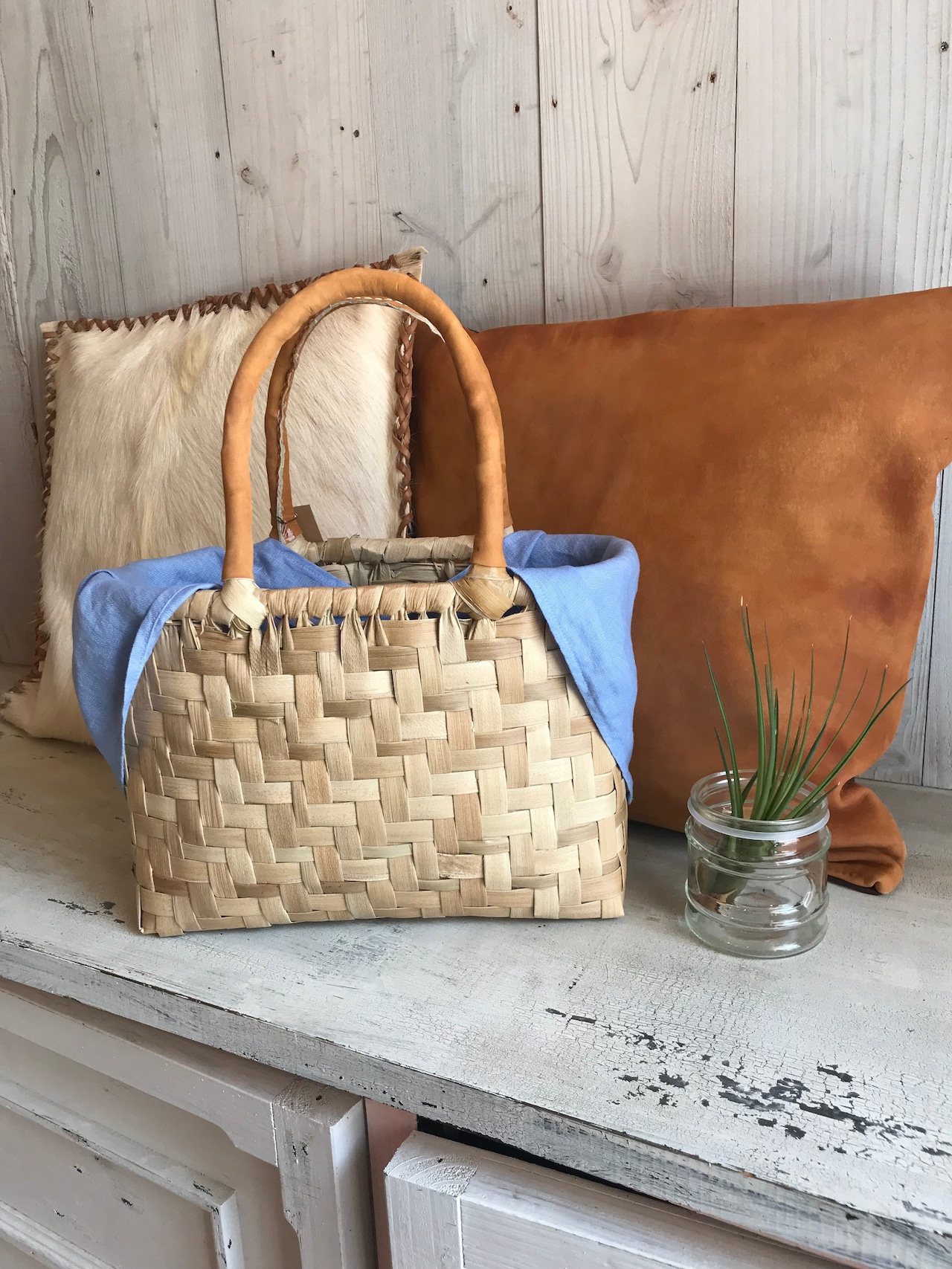おじぃの手業が光る逸品に、持ち手を牛革、中袋に手染めのリネン(麻)を足して、