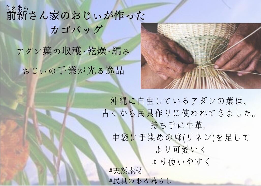 傘寿(80歳)を迎える前新のおじぃが、アダン葉の採取・乾燥・カゴ編みを手作業で作ります。